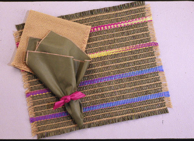 "Grosgrain" Handwoven placemats. Available in eleven color standards. Hand-dyed band changes color, or may be ordered in color specific. Machine washable, line dry. Matching chintz napkin included.